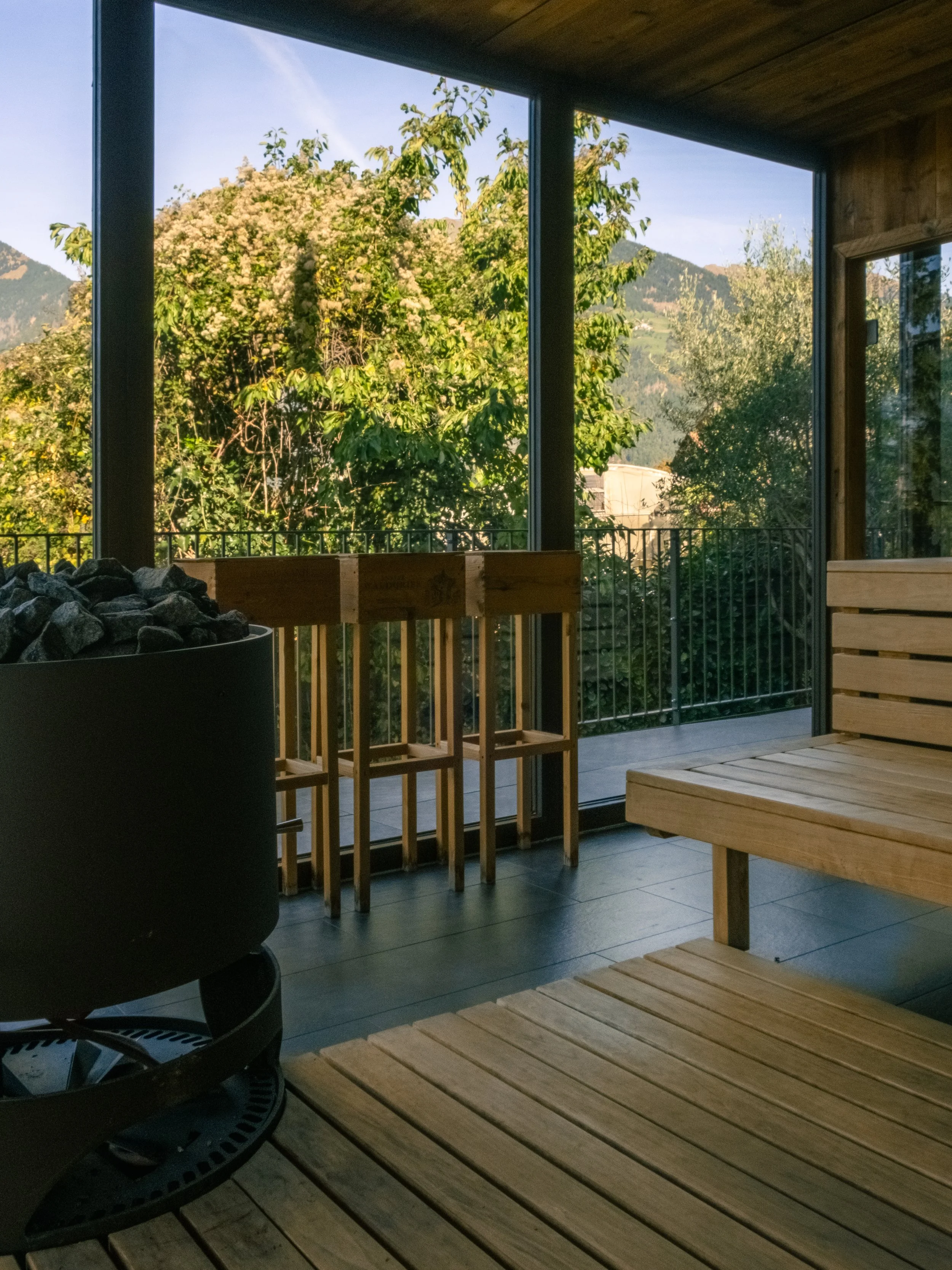 Interno di una stanza con grandi finestre che mostrano una vista su alberi e montagne, mobili in legno e un camino a legna.