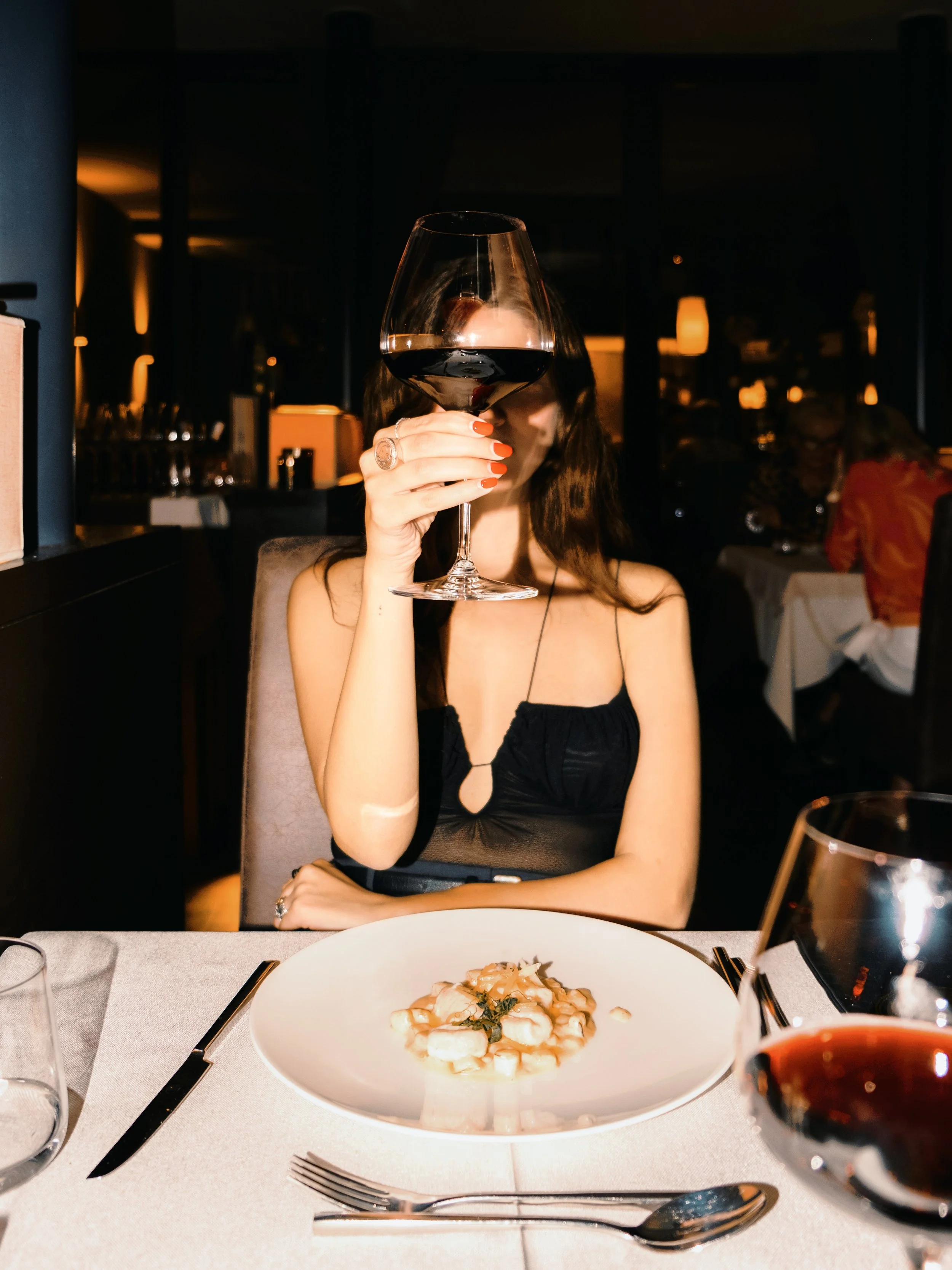 Donna seduta a tavola in un ristorante elegante, tiene un bicchiere di vino rosso davanti al volto, con un piatto di pasta conditi con un topping verde davanti a lei.