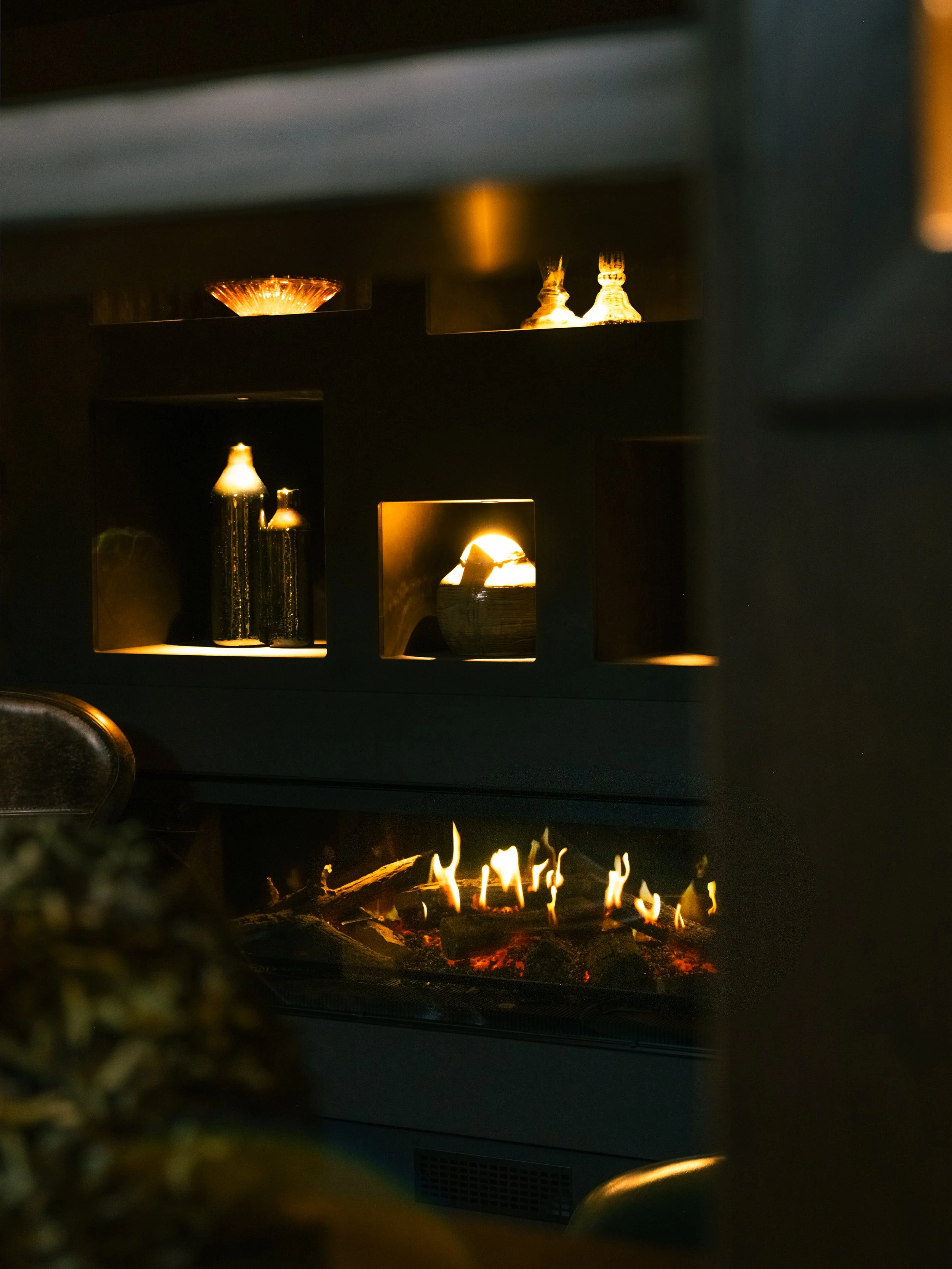 Fuoco acceso nel camino con arredi decorativi in vetro e una libreria con oggetti in vetro illuminati sullo sfondo.