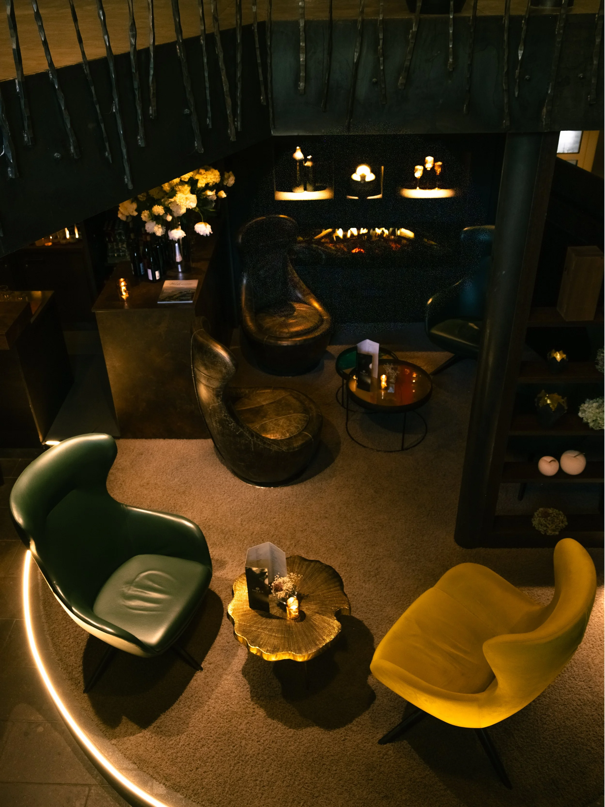 Zona lounge con sedie verdi e gialle, tavolino decorato con fiori e candele, sfondo con lussuoso camino e decorazioni floreali.