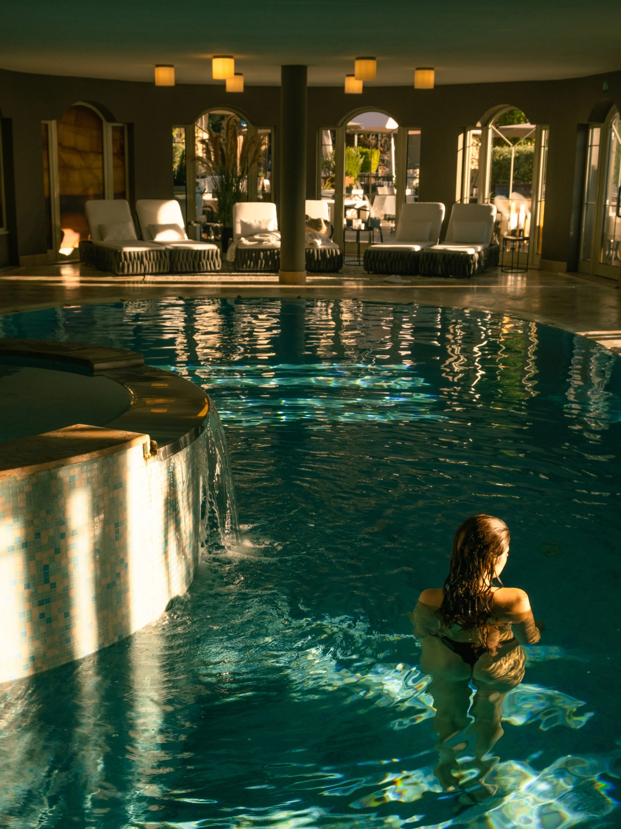 Una donna che nuota in una piscina interna con luci calde e sedie a sdraio sullo sfondo.