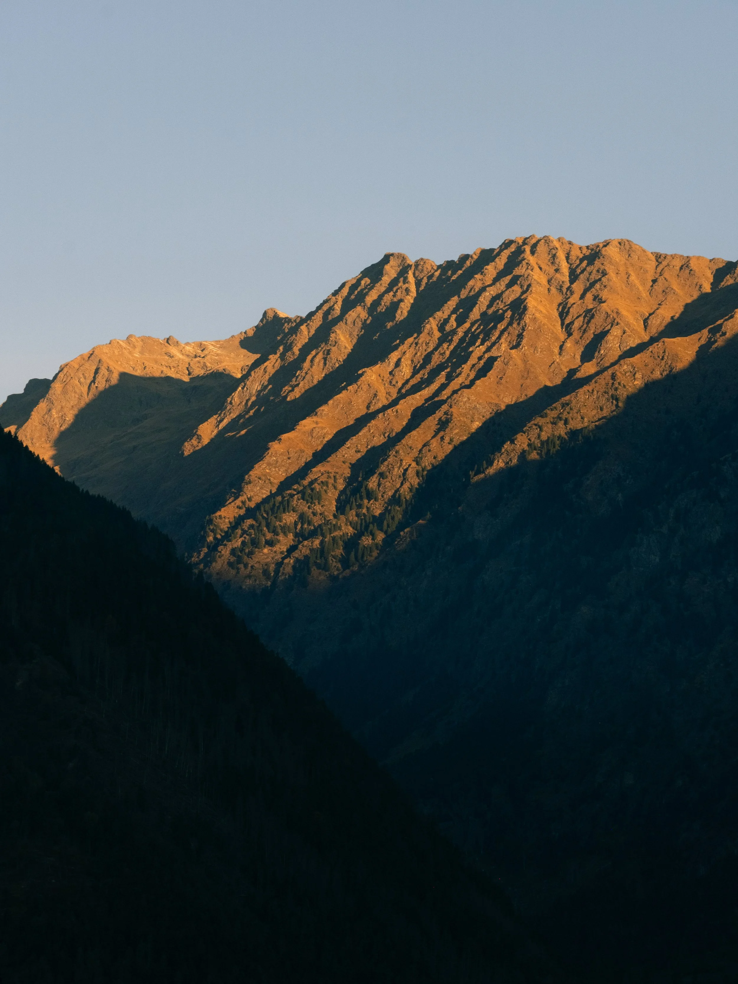 Montagne con cime rocciose illuminate dal sole al tramonto, con ombre sulle pendici boscose.