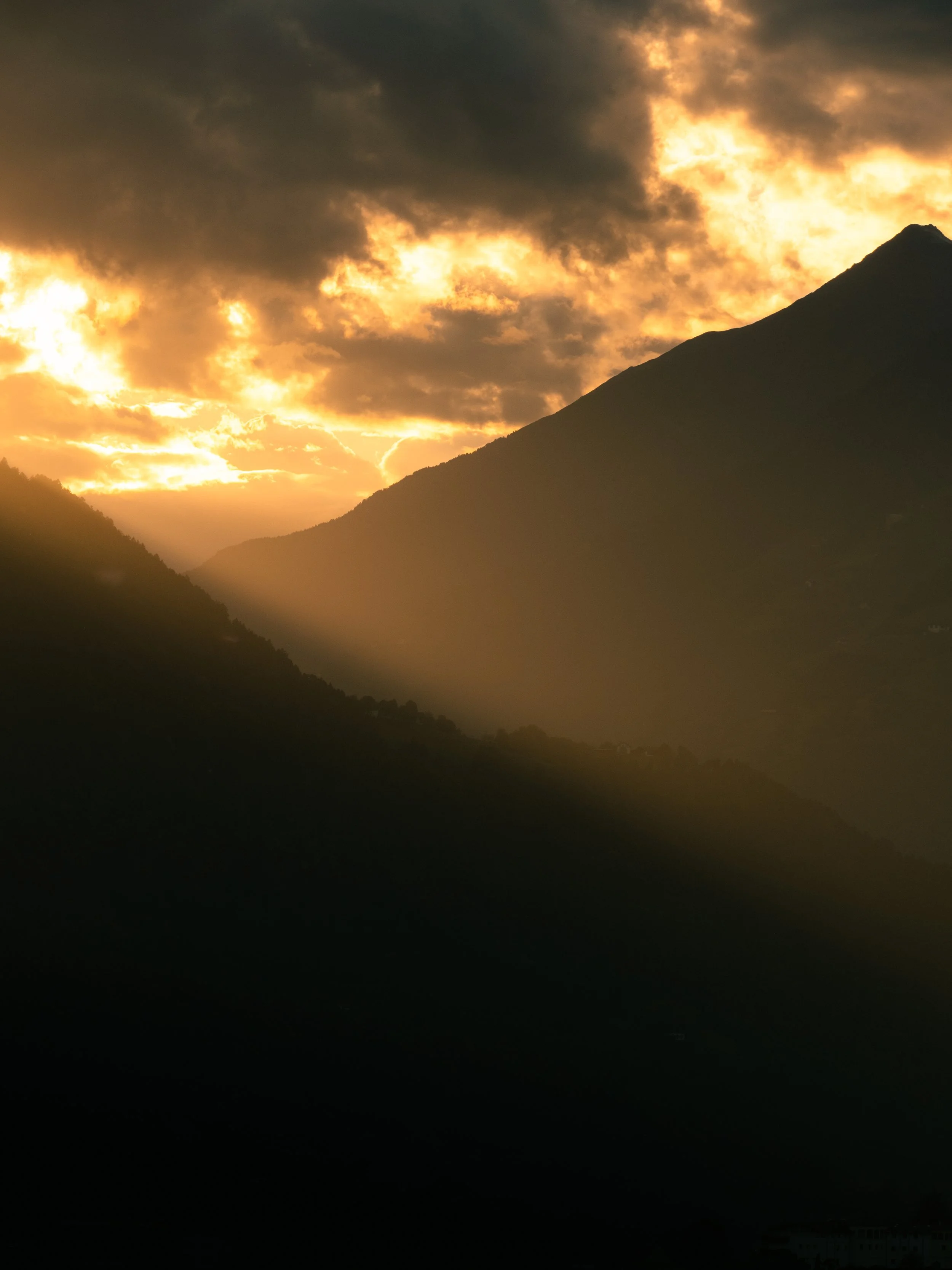 Sonne che splende attraverso nuvole scure sopra montagne verdi.
