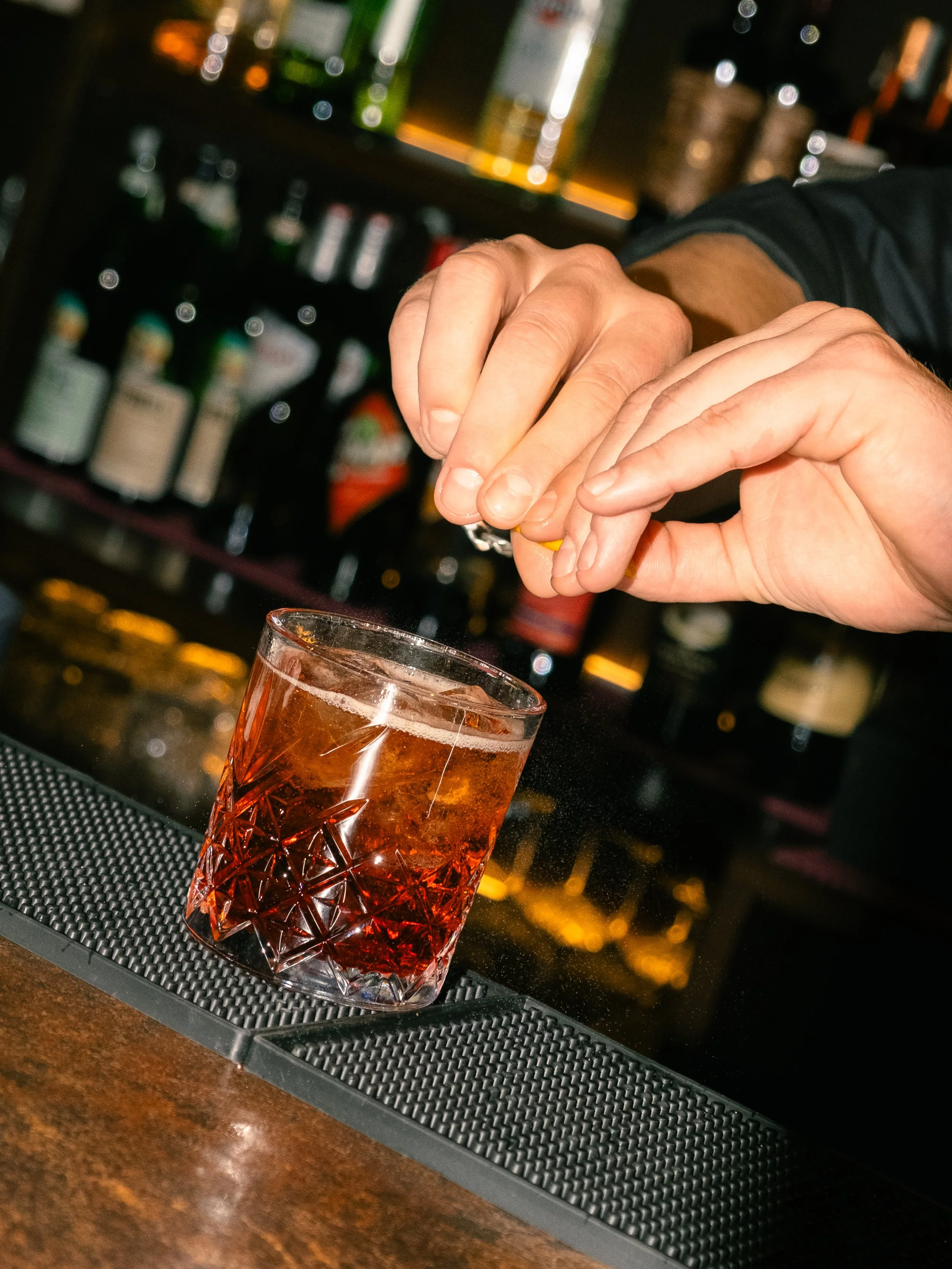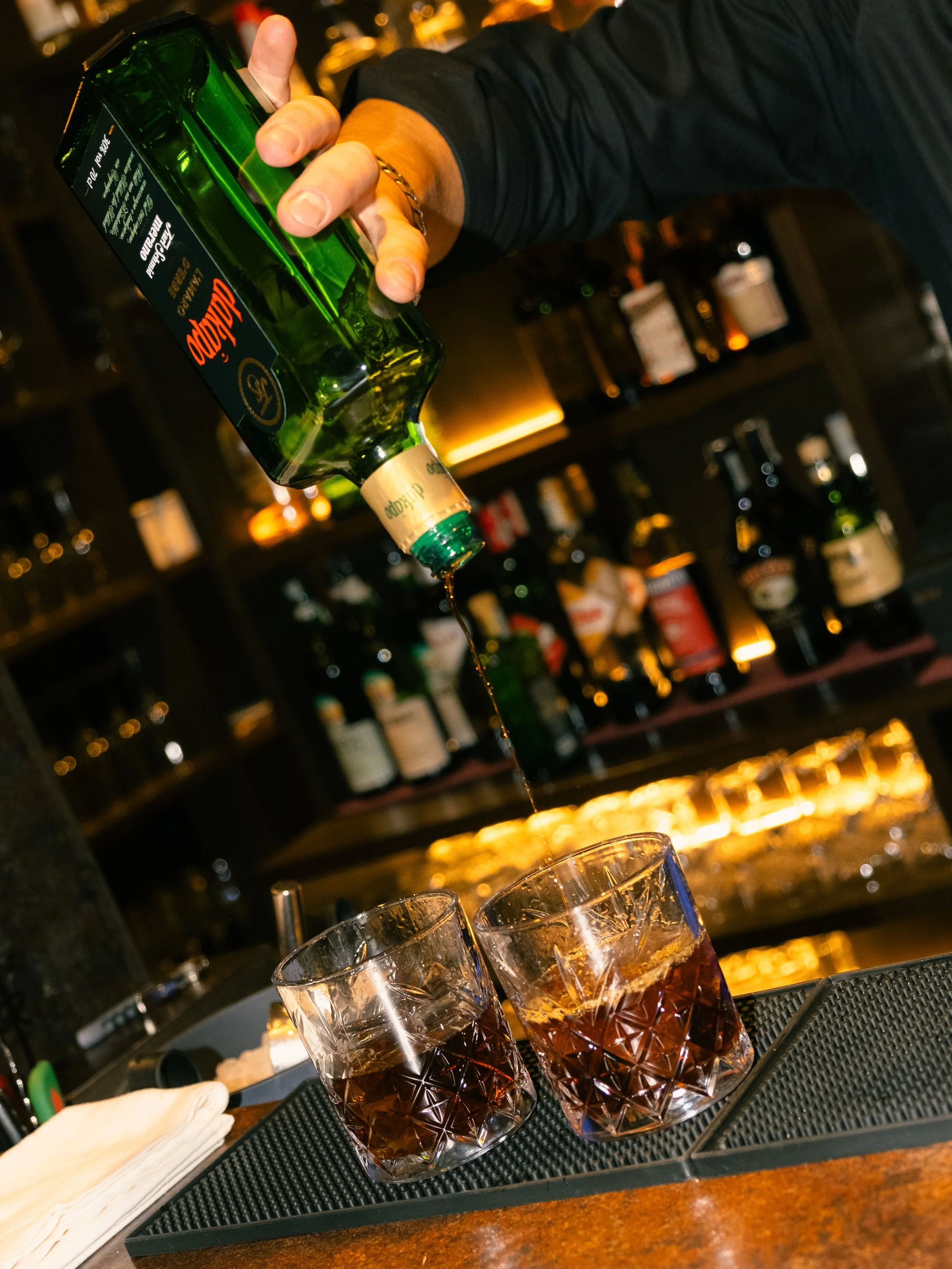 Un barista versa un cocktail dall'ampia bottiglia di alcol su due bicchieri con ghiaccio e una bevanda scura, sul bancone di un bar con scaffali di bottiglie di alcol in sfondo.