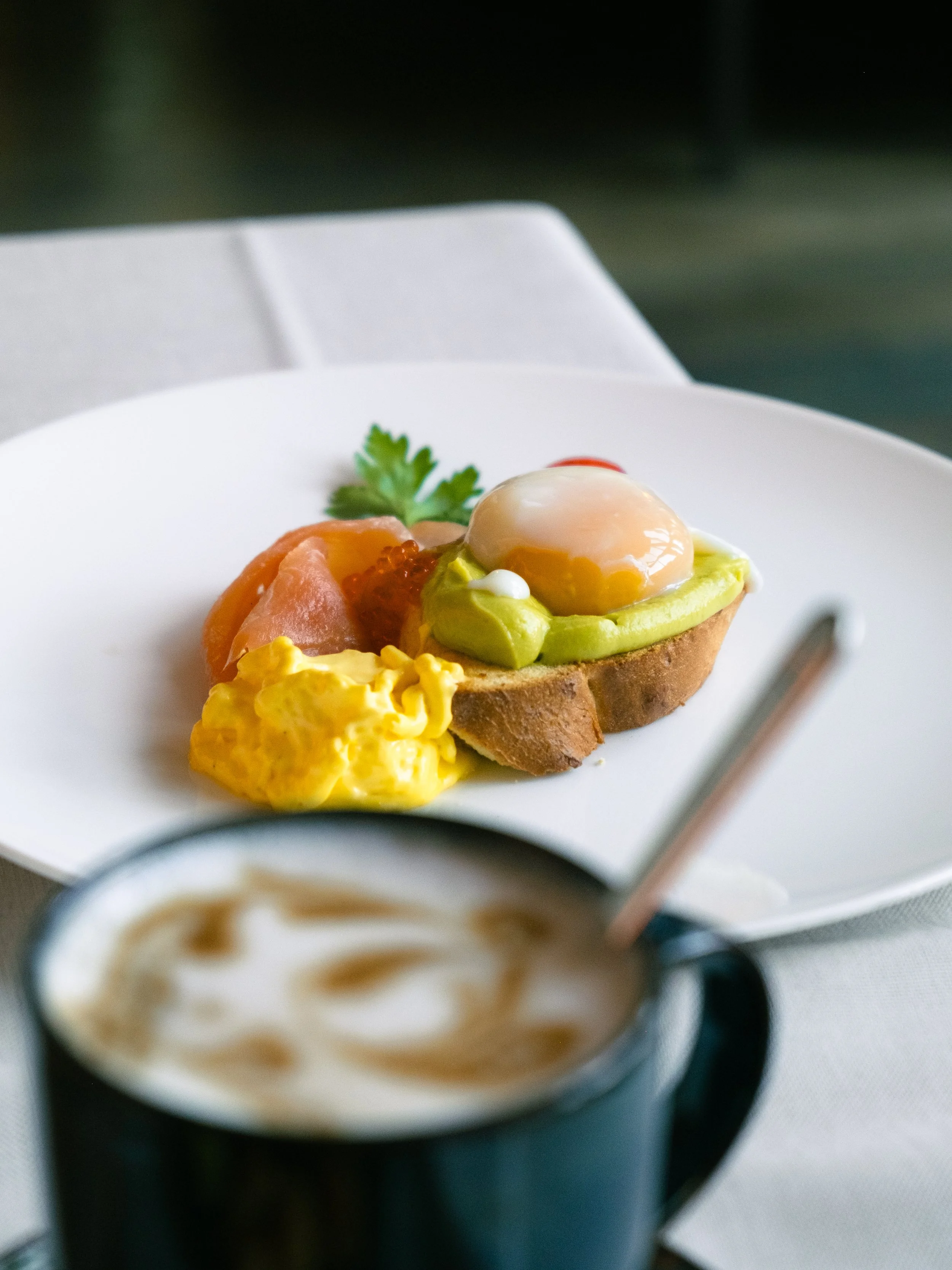 Pane tostato con avocado, uovo pochè, pomodoro, crema di uova e una foglia di coriandolo; in primo piano una tazza di caffè.