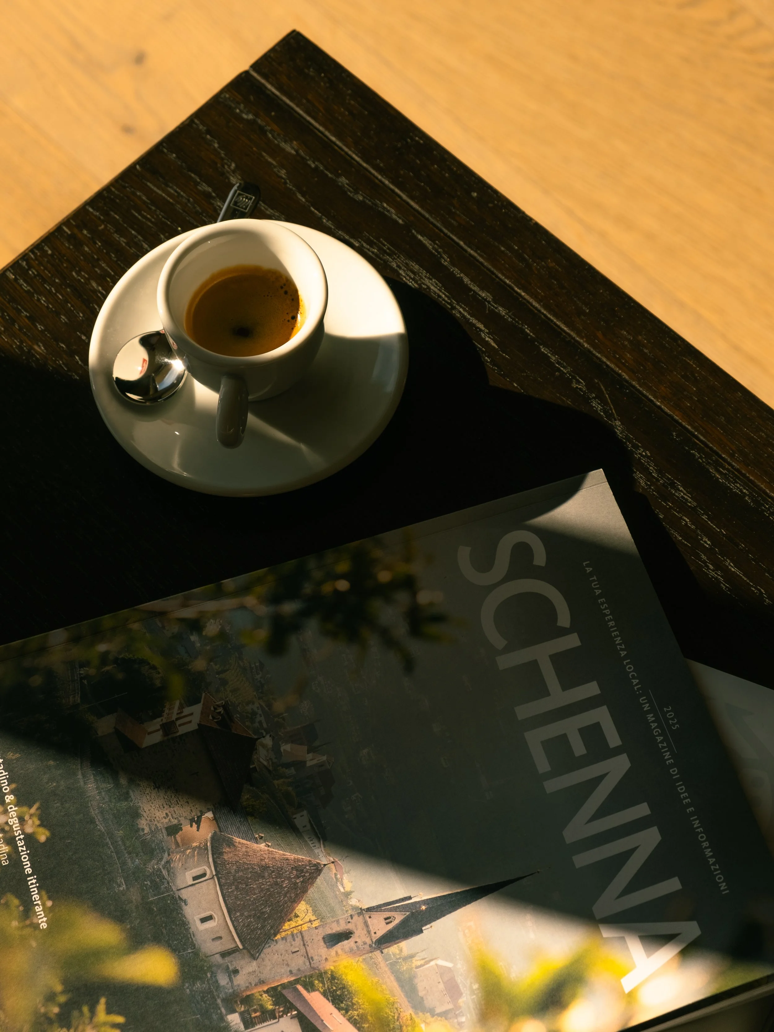 Una tazza di caffè su un piattino con un cucchiaino accanto, posata su un tavolo di legno accanto a una rivista chiamata 'SCHENNA'.
