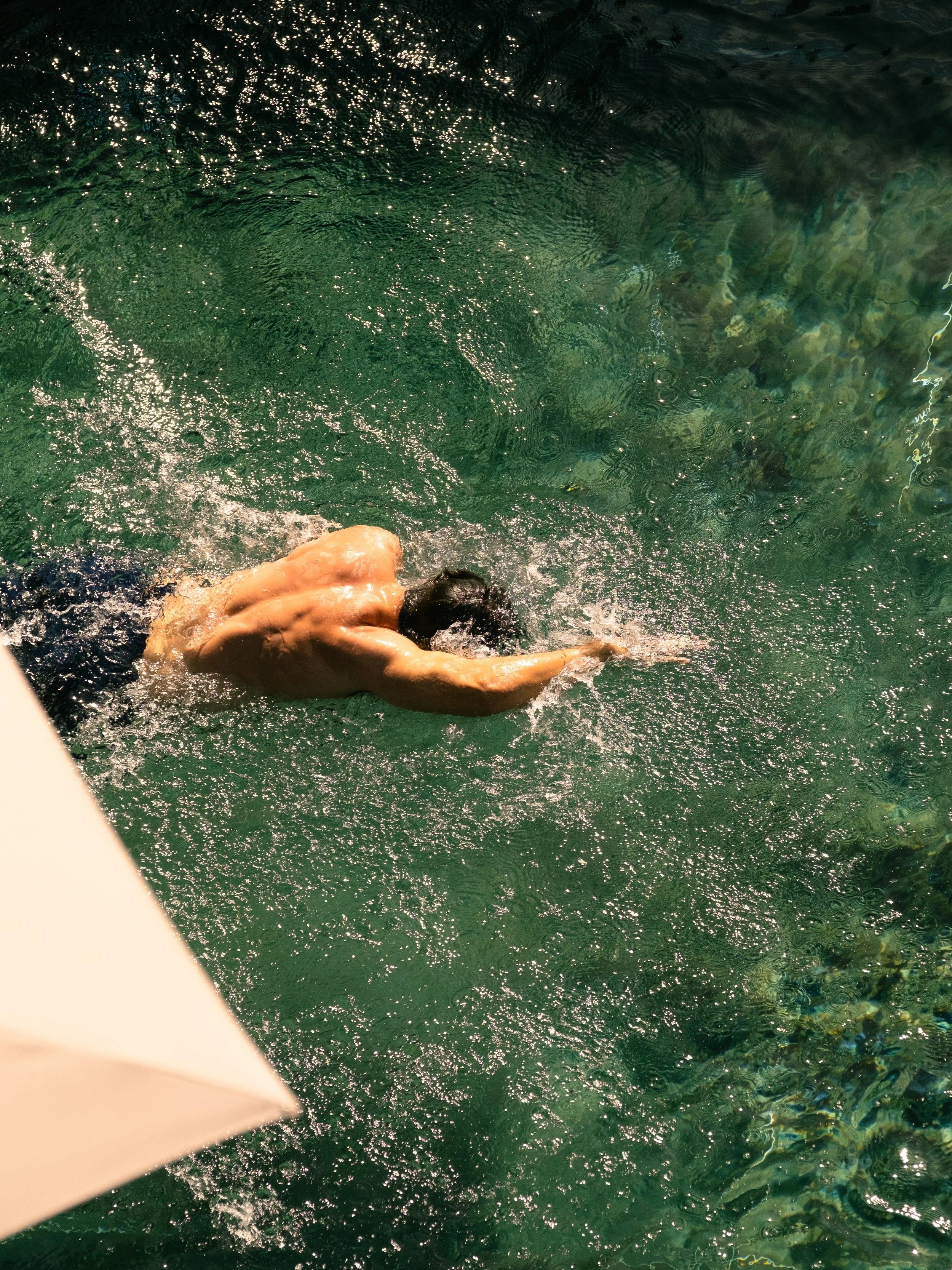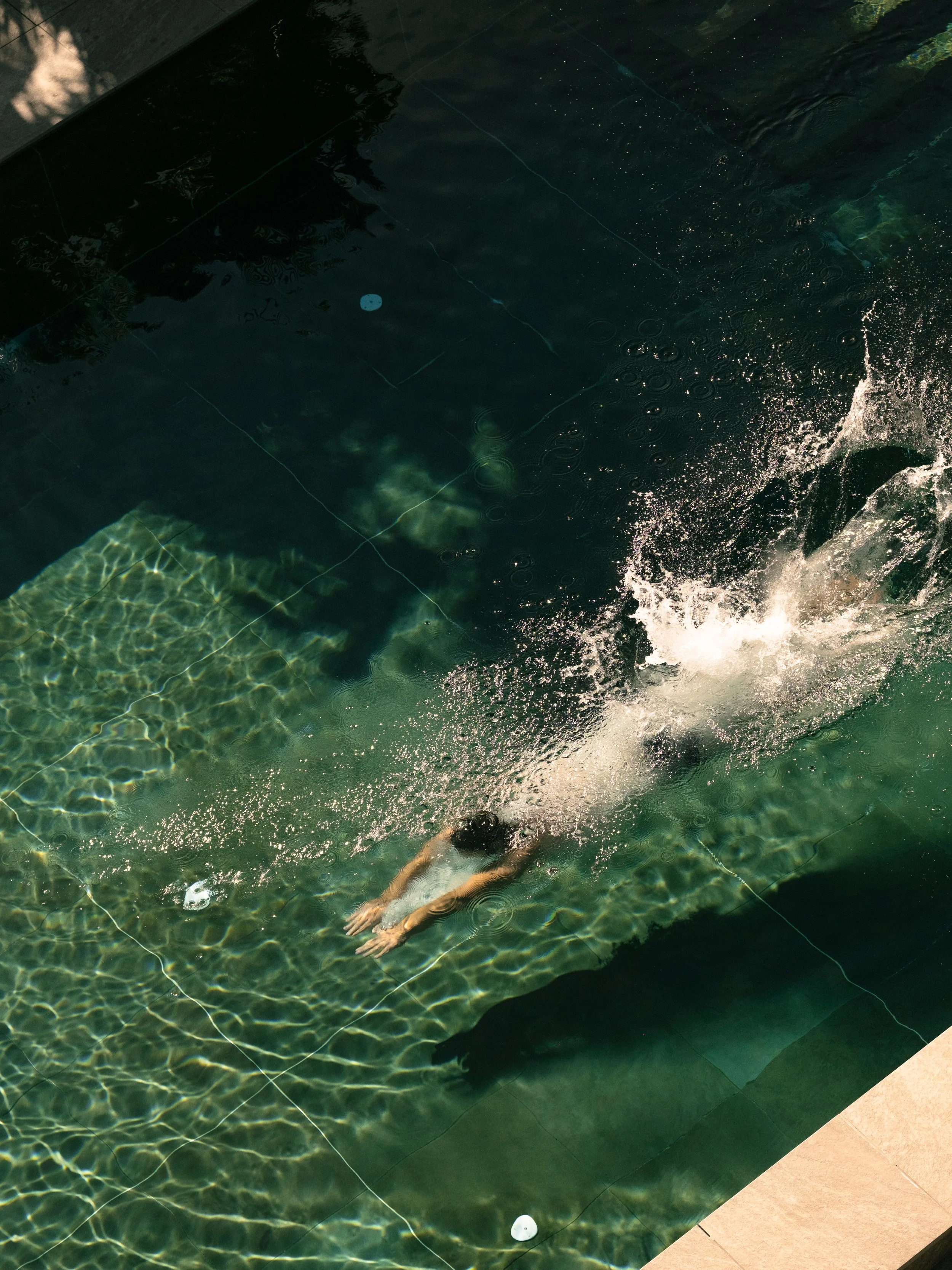Persona che fa il tuffo in piscina, con il cappello e il costume da bagno lungo, con il sole che riflette sull'acqua.