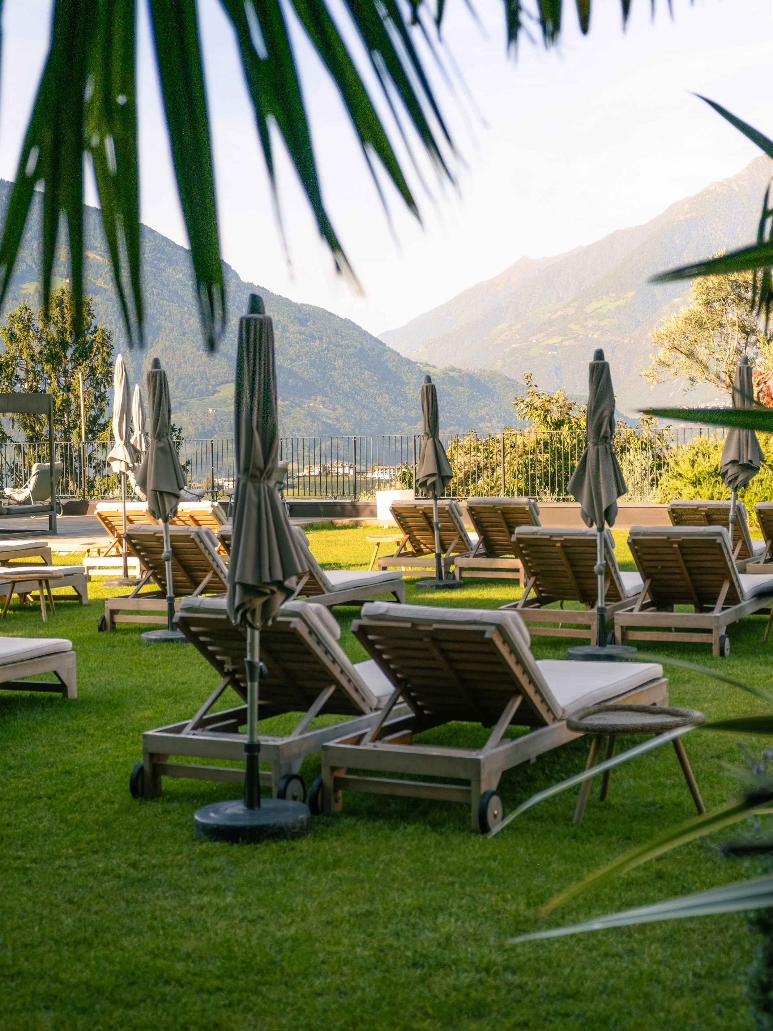 Relaxing area con sdraio di legno e ombrelloni su prato verde, con montagne sullo sfondo.