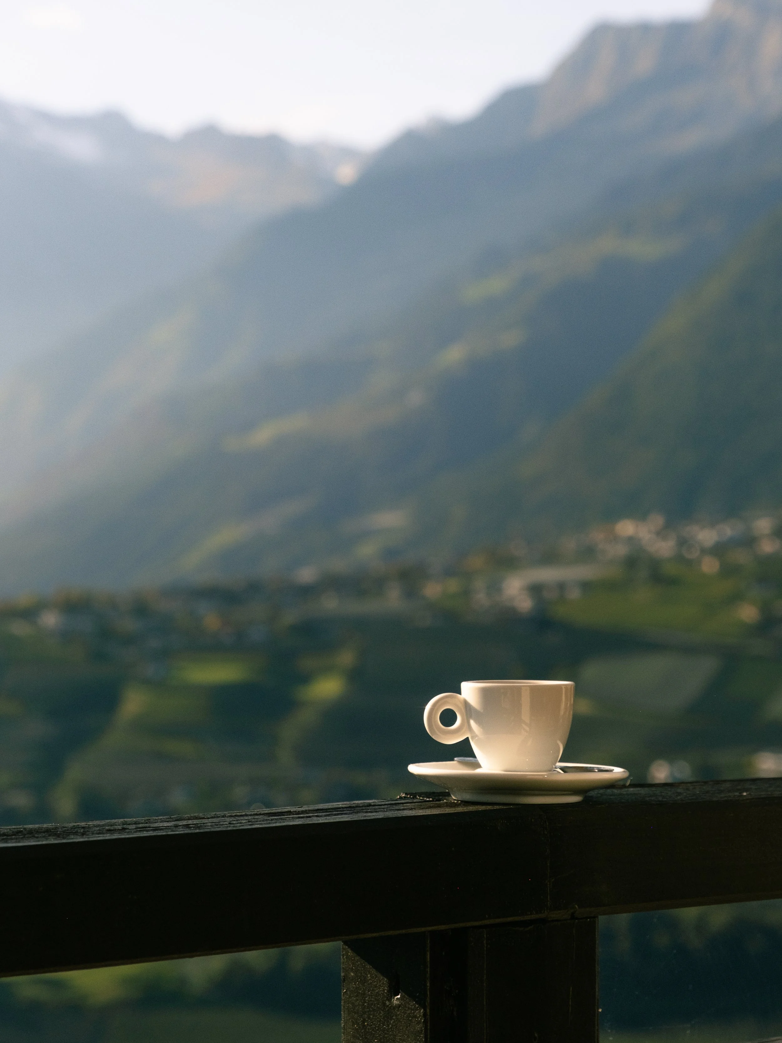 Tazza di caffè bianca su un balcone con vista su montagne verdi e nebbiose nelle Alpi.