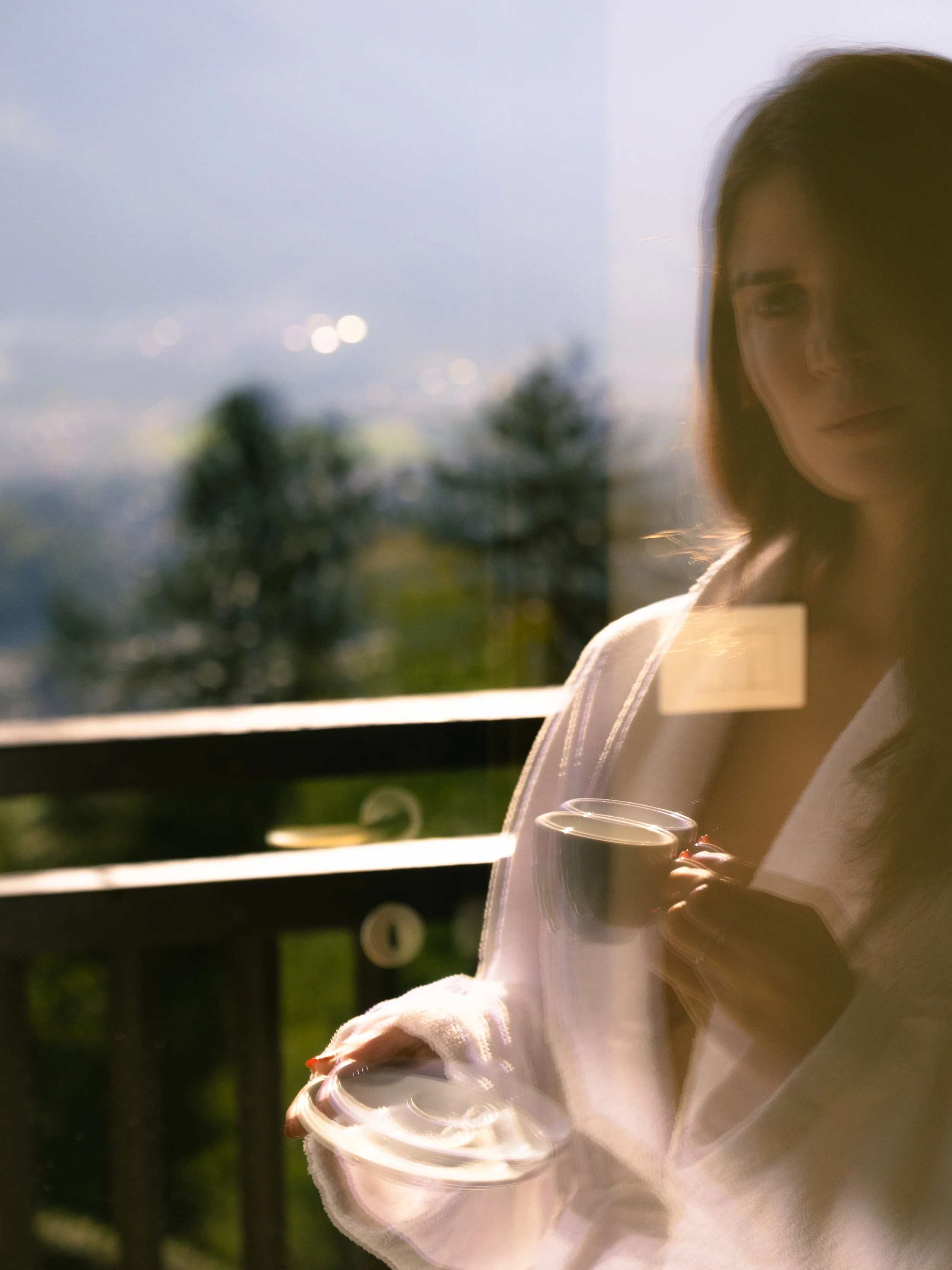 Una donna con capelli castani in un accappatoio bianco tiene una tazza di caffè su un balcone con uno sfondo di montagne.