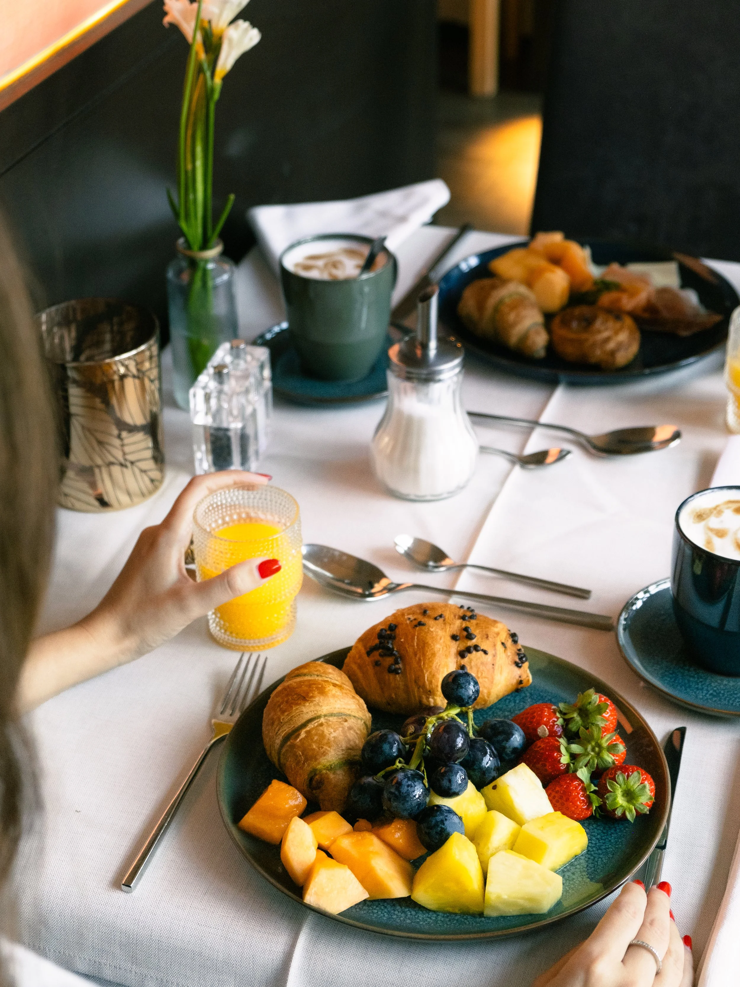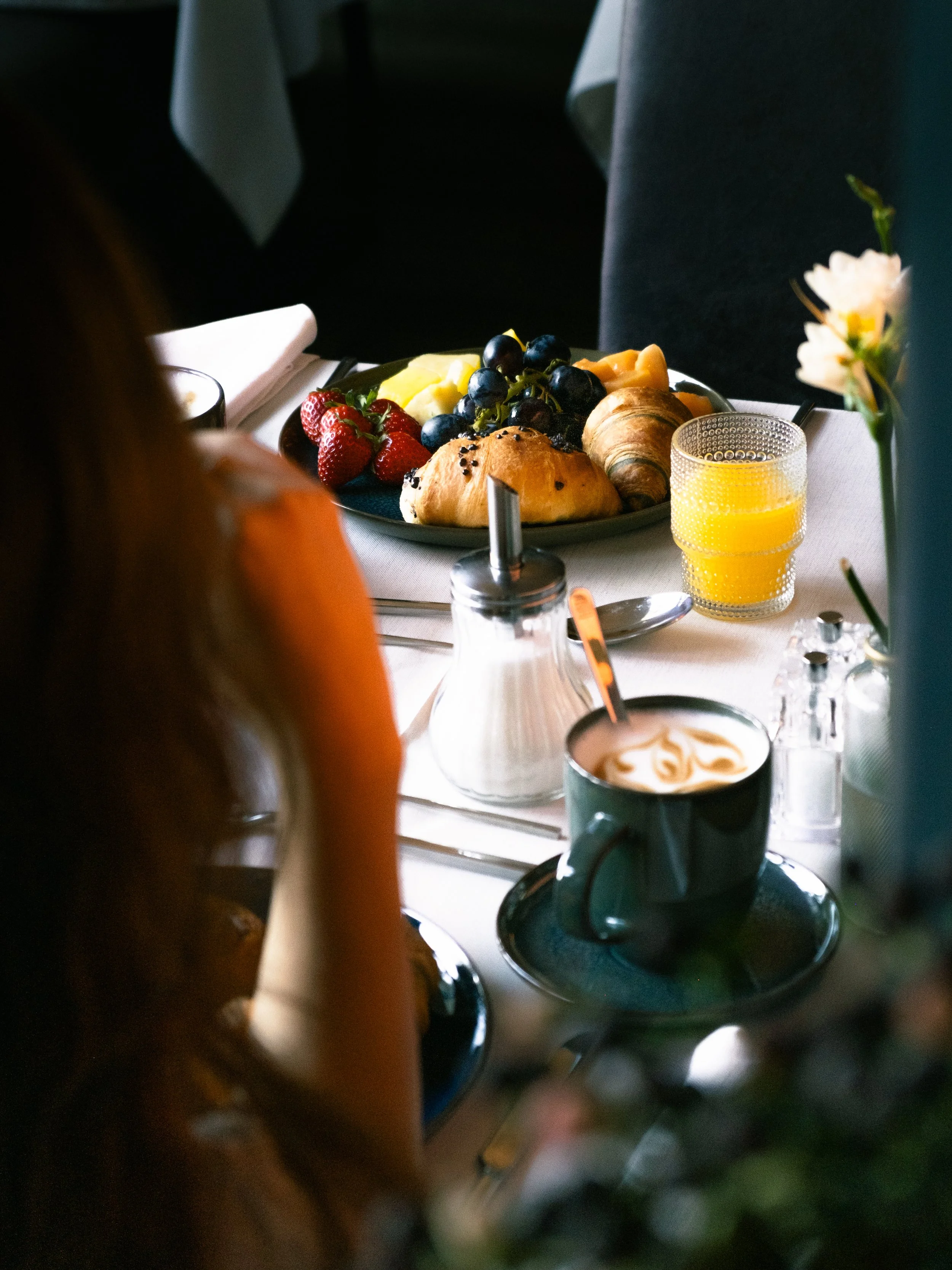 Colazione con vari tipi di frutta, croissant, caffè con latte decorato, succo d'arancia, e altri alimenti su un tavolo.