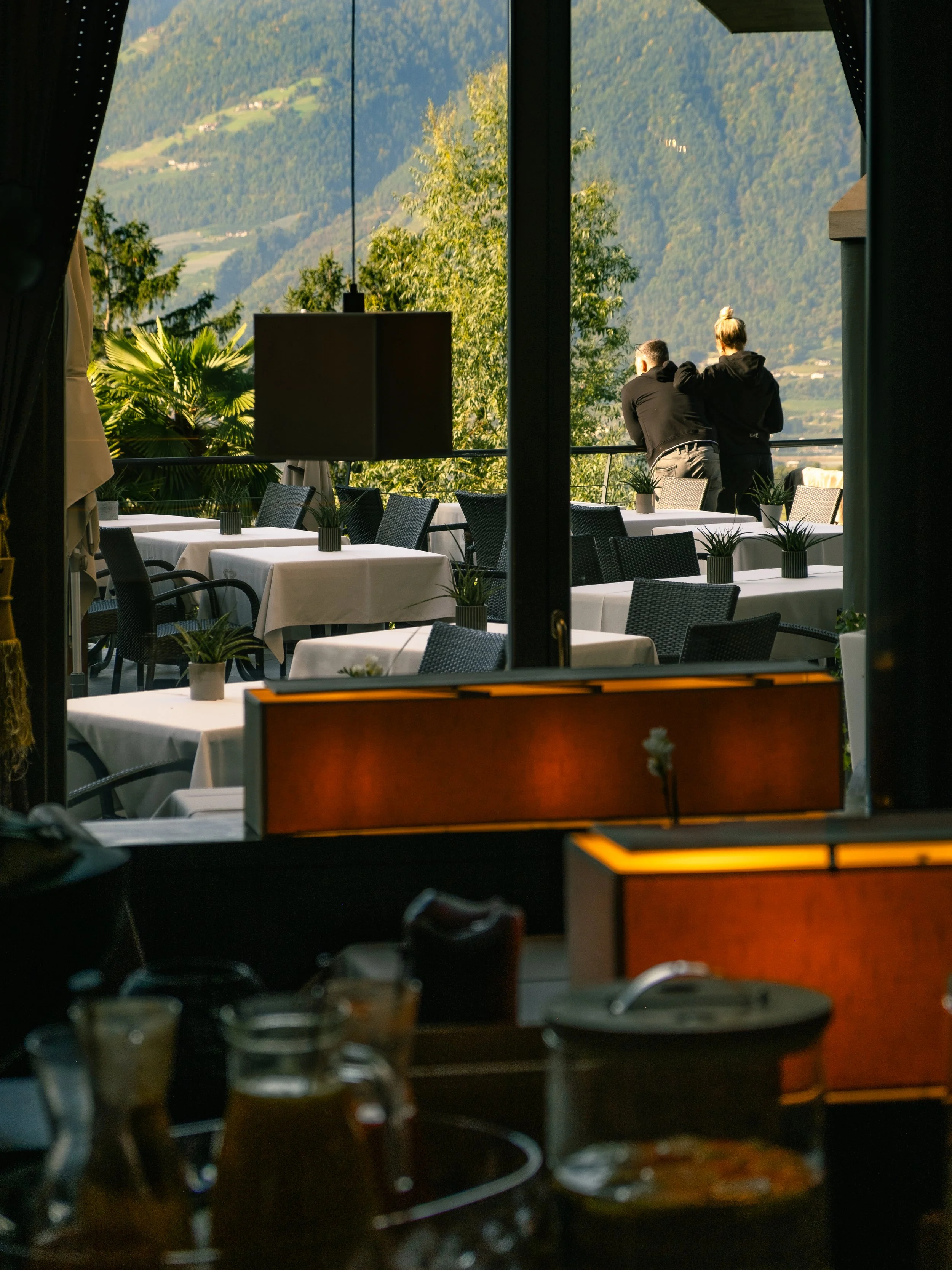 Interno di un ristorante con tavoli e sedie, vista all'aperto su un paesaggio montano con due persone che guardano il panorama.