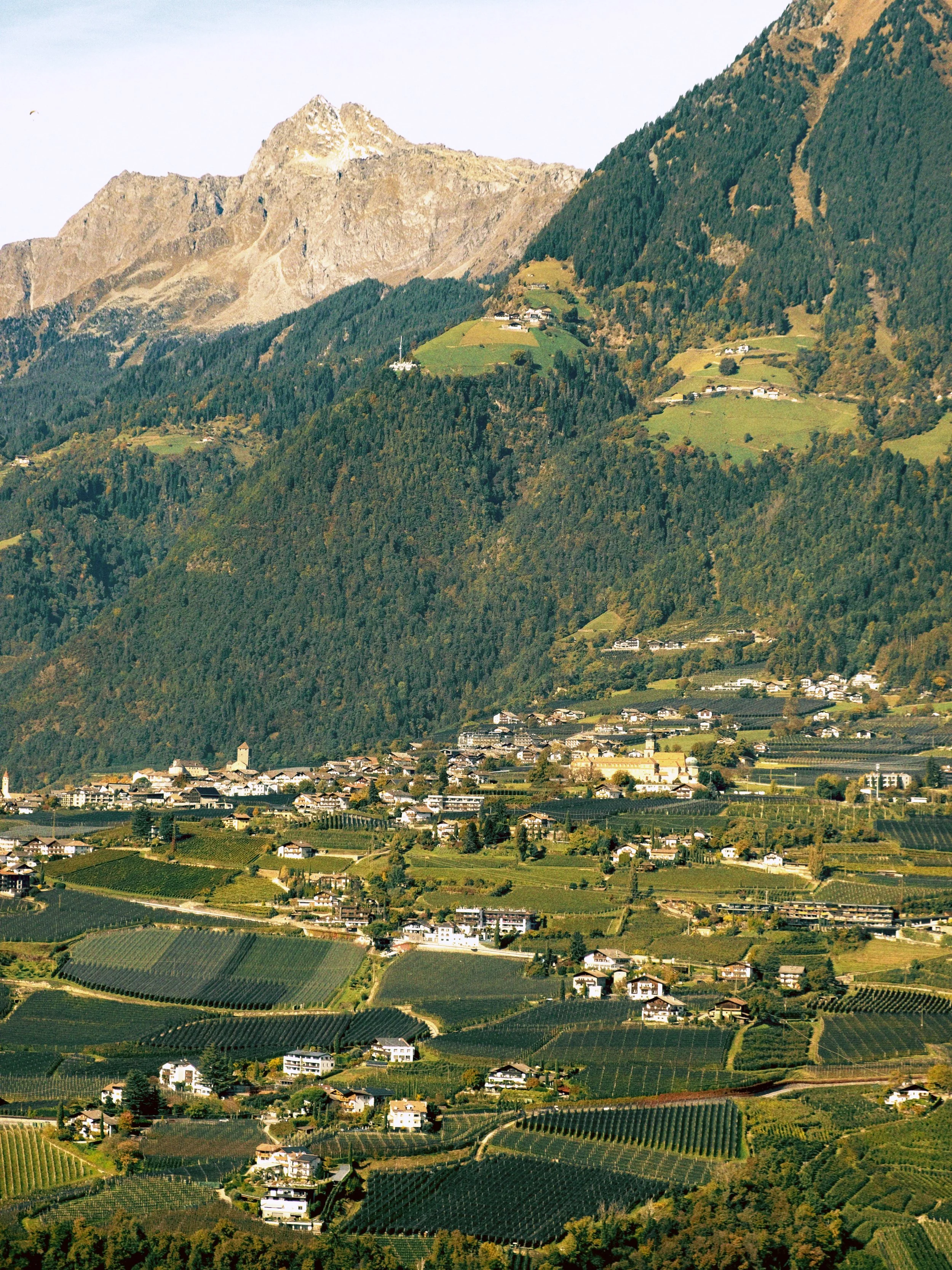 Paesaggio di montagne con boschi, verdi e coltivazioni, con case sparse e un villaggio in basso.