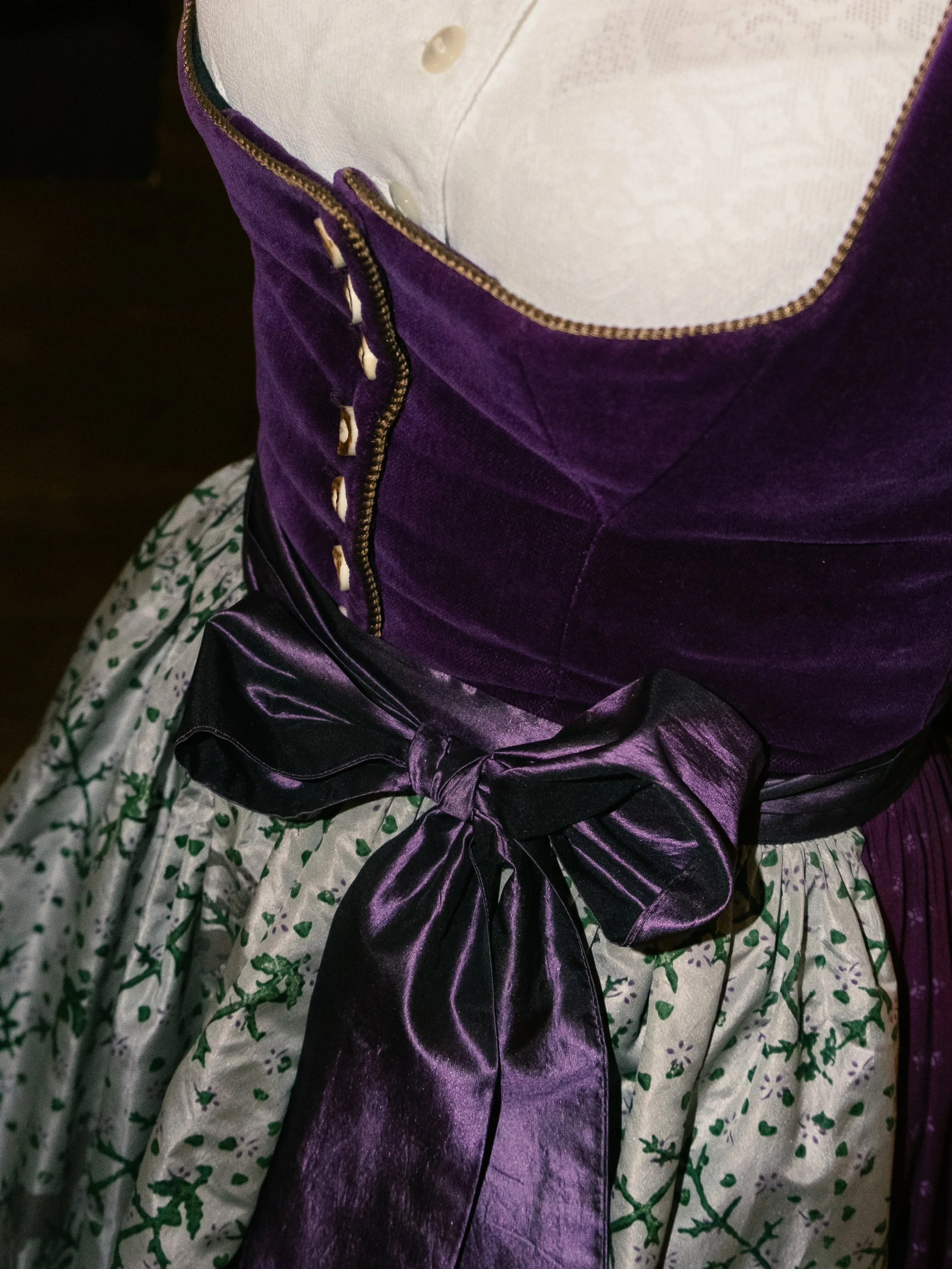 Abito tradizionale con corsetto viola, gonna con stampa floreale verde e bianca, e fiocco viola in vita.